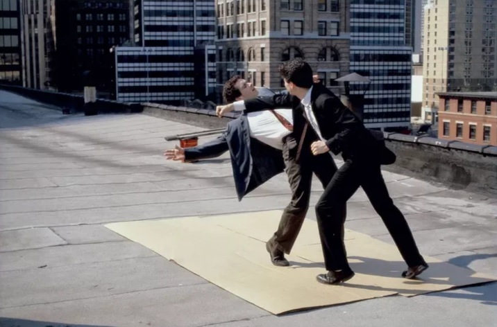 «Men in the cities» (1976-1982) réalisée par le photographe, graveur et sculpteur Robert Longo série dans laquelle il amène ses sujets en costard-cravate sur les toits de New York. Durant les séances il leur jette toute sorte d’objets dessus, leur objectif: éviter les projectiles. Les photographies sont par la suite recrées sous forme d’illustrations au fusain sur fond blanc avant d’être offertes par l’artiste au Centre Pompidou à Paris.